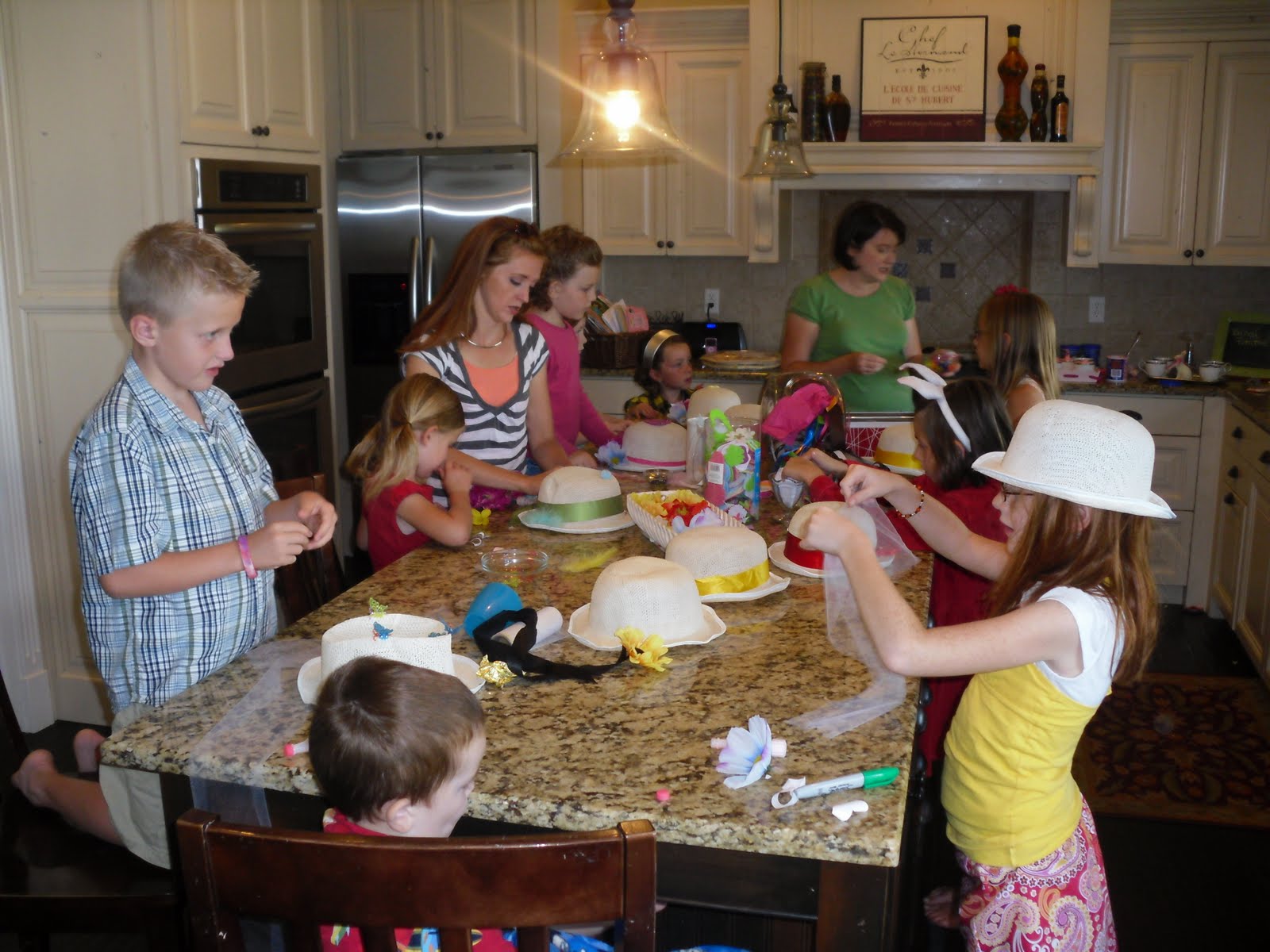 For Lauren's 6th birthday, we celebrated with an Alice in Wonderland Tea Party. The kids had to chase white rabbits, eat and drink potions to get bigger and smaller, paint roses red, and make mad hats for a final tea party. It turned out to be a lot of fun and a great party!